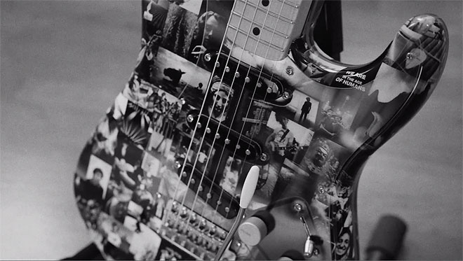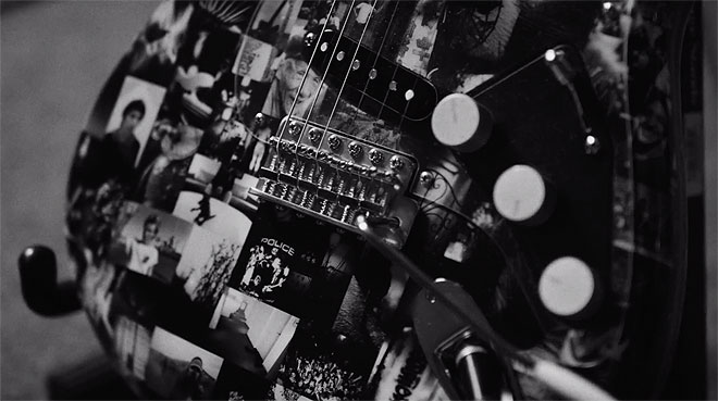 「このストラトキャスターギターは本当にインスピレーションを与えてくれるんです。」と彼は付け加えた。「Fender Custom Shopの本当に信じられないことは、ギターのボディに私の写真コラージュを貼り付けたことでした。彼らがどうやってやったのかまだわかりません! ここにある写真の多くはプライベートなものであり、スティングとスチュワートの写真もいくつかあります。ある意味では、これらの写真は長年にわたる自伝とも言えます。」