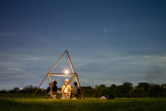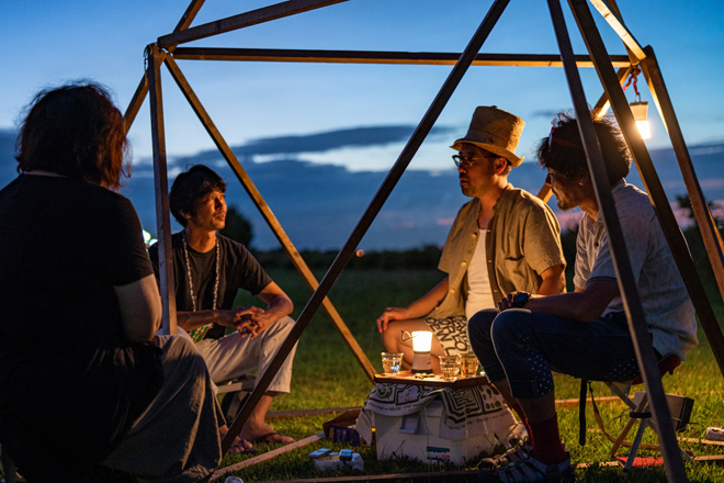 音楽とキャンプを楽しむフェス<朝霧JAM>に自分たちの遊びを加えてとことん楽しむ遊びの達人“宇宙大使”とは何者で、どんな経緯で現在の参加スタイルへと辿り着いたのかを解き明かすため、指定された多摩川河川敷へと向かった。夕暮れ迫るそこには明らかに人目を引く三角形の木のフレームで創られた謎の空間があり、その中に彼らはいた。