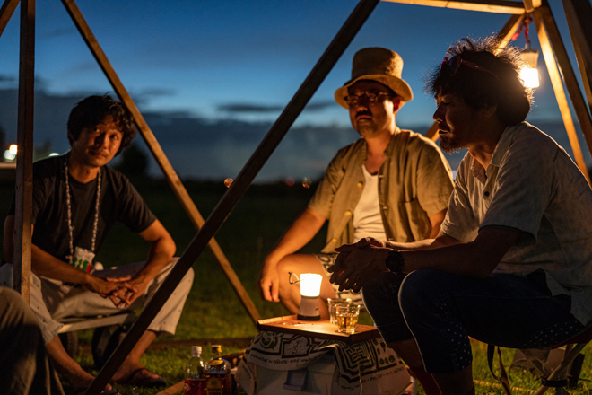 ◎ソーラー:全部プログラムにあるのは面白くないと思うんですよ。たまたまそこにいてラッキーなのがいい。予定調和じゃないことが全体の中の何パーセントかあってもいいし、隣りにテントを立てた人との出逢いも楽しみましょうって思う。めんどくさいダメな人が隣りに来てもそれを楽しんだ方がいい。子どもを連れて来る人、おじいさん一人で来てる人、若者だけで来ている人もいる。いろんな世代の人が偶発的に集まったんだから、その人たちでどう楽しむかを作るほうが奇跡的でいいから。