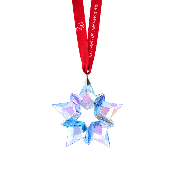 同アイテムは90面のファセットを施したスワロフスキー・クリスタルにブルーのオーロラボーリエイラス・エフェクトが輝く、星形の華やかなクリスマスオーナメント。レッドのサテンリボンには“All I Want For Christmas Is You”の文字とマライアのイニシャルがあしらわれている。