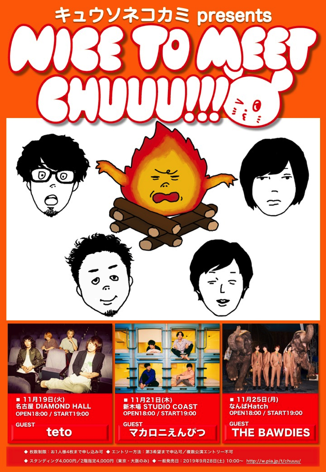 <NICE TO MEET CHUUU !!!>は、キュウソが面識はあれどもまだツーマンを実施したことがないバンドを招いて開催する、タイトル通り“NICE TO MEET CHUUU(YOU)”な対バンツアーだ。11月19日(火)の名古屋DIAMOND HALL公演にはteto、21日(木)の東京公演にはマカロニえんぴつ、25日(月)の大阪公演にはTHE BAWDIESの出演が決定した。
