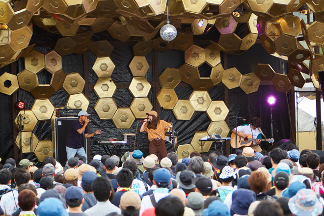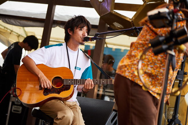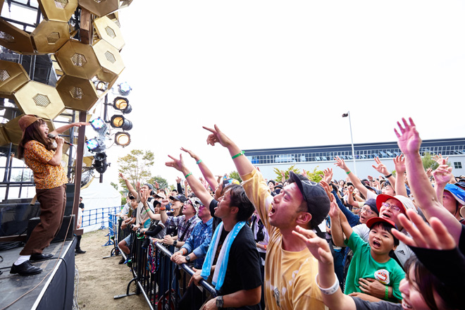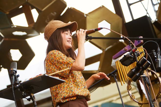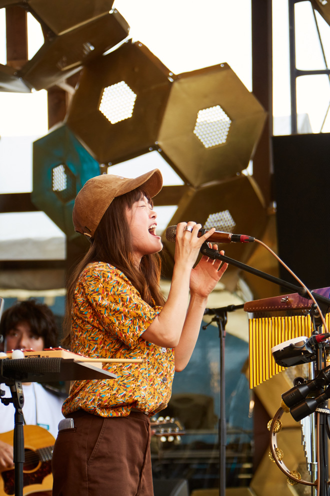 「(佐藤)タイジさんは毎年楽屋にお手紙を届けてくれるんですけど、今年も想いをしっかり受け取りました!太陽のパワーを形にする人間ってものすごいなと、改めて実感するイベントだと思います」というMCを挟み、「スケボーマン」を披露。30代男性が抱く決意の重さを、ドッシリと力強く歌い上げる。今度は「女性として感じることを書いた曲です。ネガティブな自分を慰め、みなさんの毎日に寄り添える言葉がひとつでもあったら」と語る「甘っちょろい私が目に染みて」を、メロディアスに奏でてみせた。