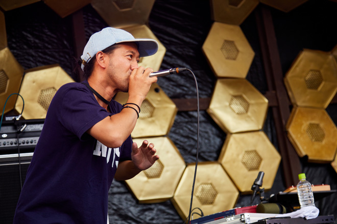 気まぐれな曇天模様の空の下、REALIZE STAGEにNakamuraEmiが舞い降りると、直前まで降っていた通り雨がピタッとやんだ。「REALIZE STAGEにお越し下さりどうもありがとうございます、NakamuraEmiです」とごきげんなフローに乗せて挨拶。「Don’t」からアクトをスタートさせた。フロアを見渡すと、縦ノリで楽しむ人もいれば、体を横に揺らしている人もいて、シンガーソングライターとラッパーを往来する彼女ならではの空間を作り上げていく。