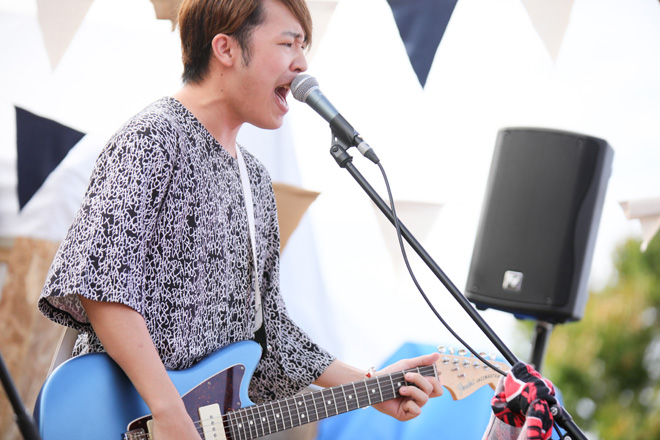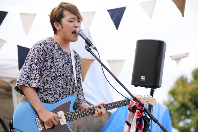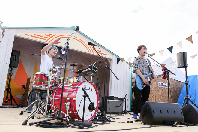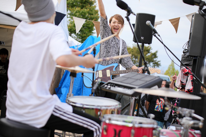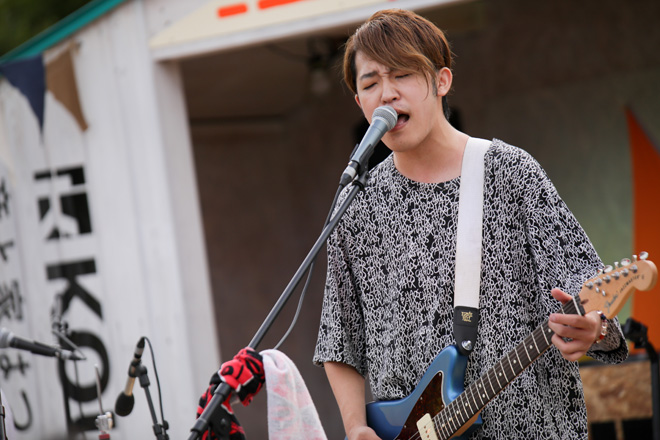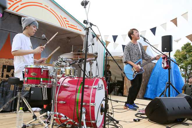 このREASSUREは飲食ブースにあるステージで、食べ物のいい香りに誘われて来た人や、のんびりと座って食事をしながらライブを見ようかという人も多いが、胃袋を満たそうとふらりと訪れた人の耳も、1曲目のど頭からがっちりと掴んだようだ。20代のふたりだが(山岸は二十歳)、子供の頃からそれぞれギタリストとしてドラマーとして才を認められ、数々の年上のミュージシャンと共演してきた者同士である。しかし同年代同士でのセッションは格別の楽しさがあるのか、饒舌なギターとドラムの掛け合いが観客の興奮メーターをあげる。曲中、最高に気分が上がったのか、山岸は「ちょっと、ギターソロ弾いていい?」と嬉しそうにギターに指を走らせる。続く「日常」では歌をじっくりと聴かせながらも、ギターとドラムというふたつの楽器だけとは思えない、密なサウンドを編み上げていった。