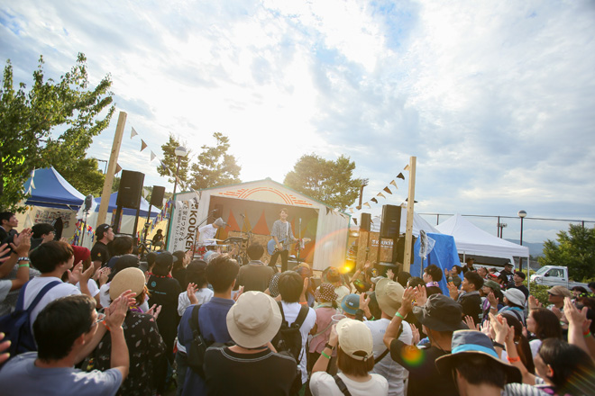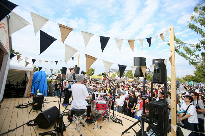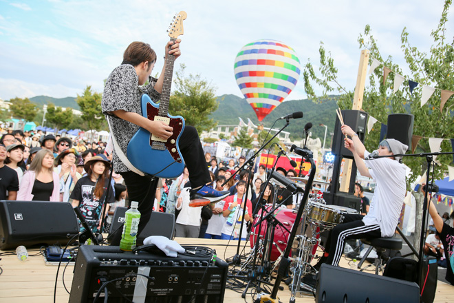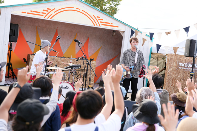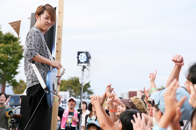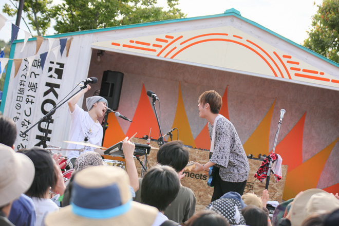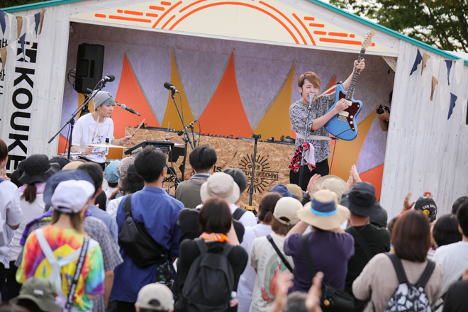「ほっこりしたよね。3歳くらいでギターをはじめた時の記憶が蘇った」と山岸が言えば、KenTは「初期衝動だよね」と語る。ワークショップでは参加した子供たちのお父さんやお母さんにお題をもらい、子供たちと一緒に即興で曲を作ったが、このステージでもそれをやりたいとCのコードでふたりで即興のセッションを繰り広げた。タイトルは「ソーラーブドウカン」。ラップのようにフェスへの思いを乗せながら曲が進んでいき、徐々に熱を帯びていくと「ここで、KenTのドラムソロが聴きたい」と山岸。KenTは、「こんなところでドラムソロできるなんて最高に気持ちぃやん」と歓声を上げさせながら、テクニカルかつアグレッシヴなドラミングで魅せ、「晴れてよかった!」と叫びをあげる。その姿を嬉しそうに眺めていた山岸も、「ええソロ叩かれたら、ギターソロやりたくなった」と扇情的なギターを聴かせる。KenTに「スーパーどや顔(笑)」と突っ込まれていたが、クリエイティヴな者同士、しかもふたりとも華のあるショーアップした魅せ方ができるから面白い。時間に限りがなければ日が暮れるまでプレイするんじゃないかというくらいの熱量で、この日にしか聴けない1曲「ソーラーブドウカン」ができ上がった。