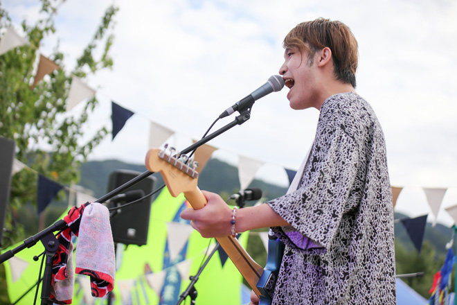 REASSUREステージに登場したのは、<中津川 THE SOLAR BUDOKAN>ではお馴染みであるムッシュかまやつとKenKenとのスーパーファンクバンドLIFE IS GROOVEでギターを務める山岸竜之介。今回はソロ名義で、“大の親友”The Winking Owlのドラマー・KenTを相棒にしたステージだ。登場するや、観客に一生のお願いを発動し「山岸竜之介 with KenT、はじめます。座っている人も、後ろにいる人ももっと前にきて!」(山岸)と語りかけ、「雑草」からライブをスタートした。