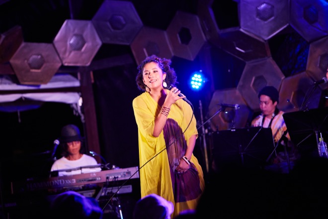 そのライヴは彼女が2008年にリリースしたメジャーデビュー・シングル「CHANGE」でスタート。早速、6人編成のバンドが奏でるファンキーでグルーヴィーな熱演に観客が手拍子で応える。そこから彼女が披露していったのは、デビューしてからこれまでの10年のキャリアをぎゅっと凝縮した全7曲。「未来 -ミライ-」「HANABI SKY」といったアップテンポのロックナンバーを繋げてから、一転、今度はバラードの「優しい赤」をじっくりと聴かせた前半戦の選曲は、ファン歴が長い人ほどうれしかったはず。