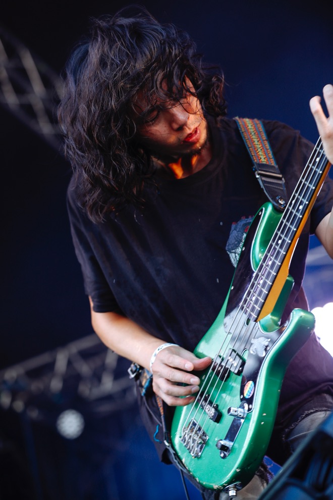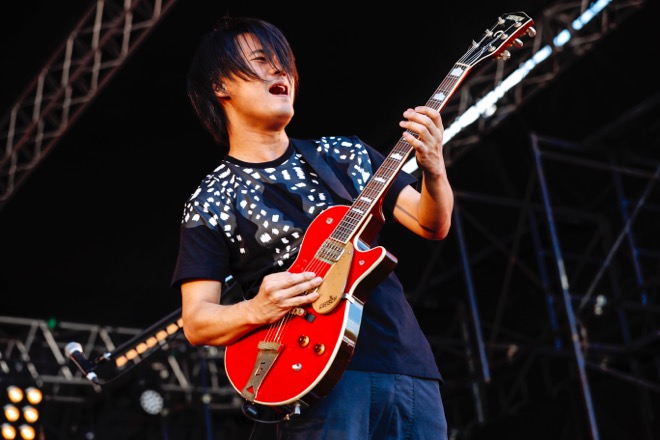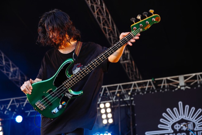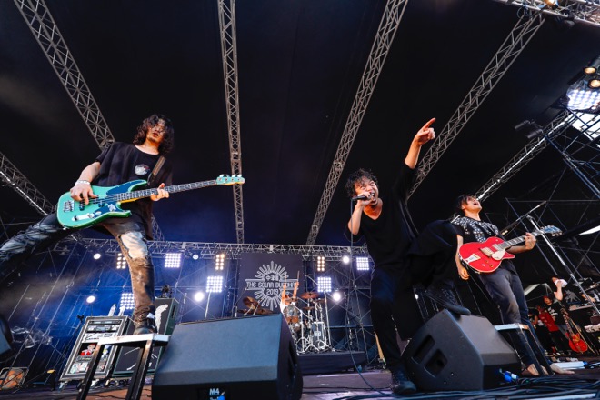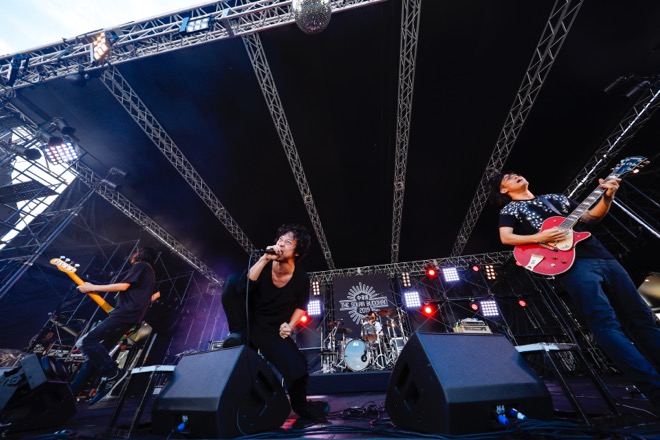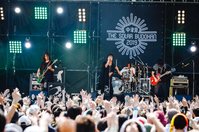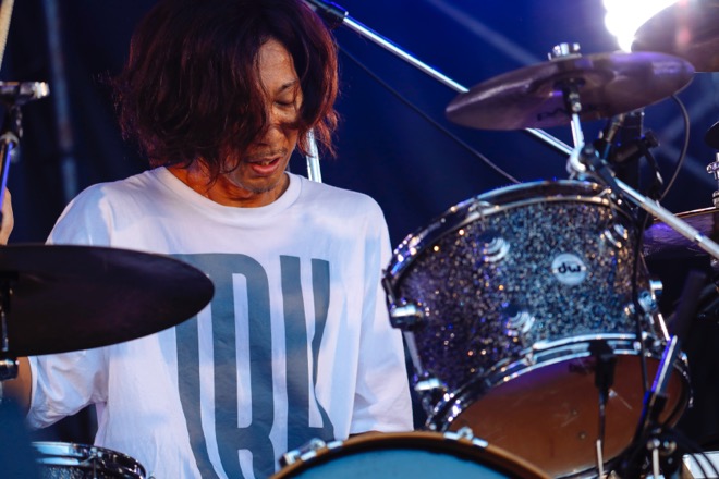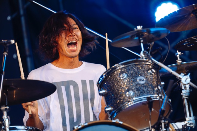 ライブは「声」よりスタート。まず感じたのは、いつもと音が違うということ。太陽光発電による出音は、普段耳にするものより膨大な情報量を帯びている。菅波栄純(G)の初号器が湛える枯れ感、岡峰光舟の6号器が放つバキバキの元気さが際立っていて、もうそれだけでこちらのテンションはブチ上がり。続いて、ギラつく太陽のおかげで火照った頬を撫でるように吹き抜ける風に乗せて「コバルトブルー」を投下。歪んだ爆音なのに胸の奥がぎゅっと締めつけられ、涙が滲んでくる。そんな切ないメロディをロックへ昇華させることこそ、彼らが20年以上磨きあげてきた持ち味なのだ。