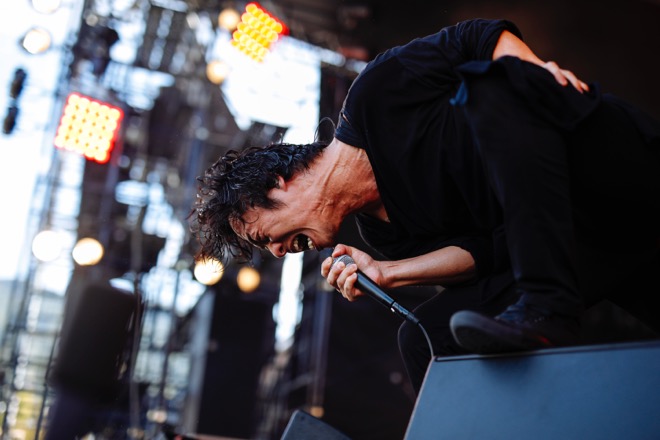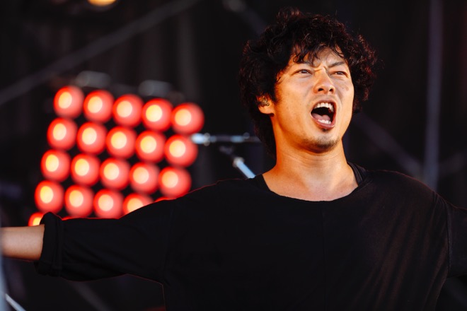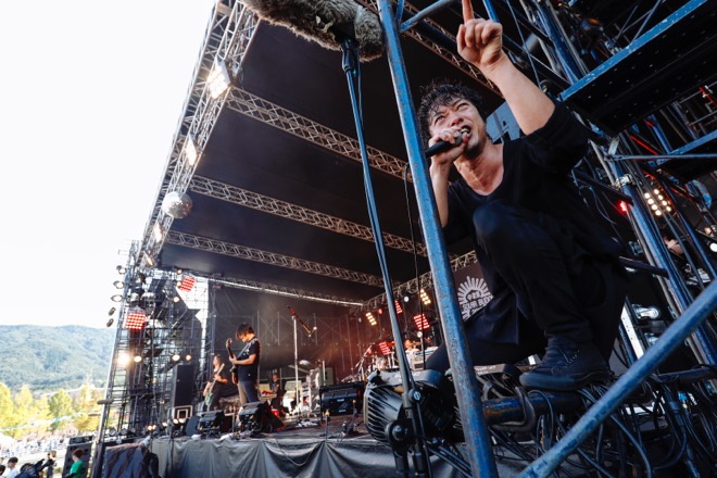 そして「この天気にぴったりだな」(山田)と「太陽の花」へ。ダンスミュージック的手法を採り入れ始めたここ数年の曲のなかでも、ライブをドッと沸かせるパワー、心の底のタガを外すような力が図抜けたナンバーだ。その流れのまま「シンフォニア」へ突入すると、山田はステージ左右の柵へ身をねじ込み、できる限り観客の近くで声を届けようとする。ラストはやはり「刃」。大地を揺るがすような大合唱をもって、疾風怒濤のアクトを締めくくった。最後に「また生きて会おうぜ!」と山田は言った。