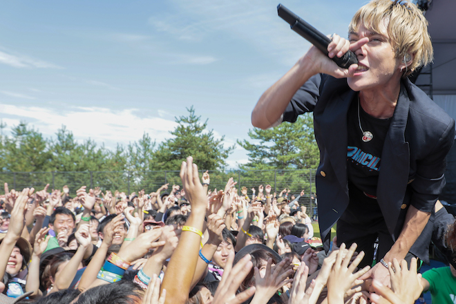 観客も一緒に「1、2、3!」というカウントの声を上げた1曲目の「エマ」から「マジック」、牧 達弥(Vo、G)が観客の上に身を乗り出しながら歌った「チェンジユアワールド」とダンサブルな魅力もあるロックンロールナンバーをたたみかけ、一気に盛り上げていった序盤が終わったところで、牧はふと青空を見上げ、観客にそう語りかけた。
