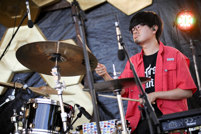 「めっちゃ気持ちよく晴れましたね!朝一で(佐藤)タイジさんを見たんですけど、この人の力だなと思ったよ。真っ赤な太陽みたいな人だよね。じゃあどんどん行くよ!」という吉田のMCを経て、「空想飛行」をドロップ。ブレイクビーツ的リズムとゴスペルライクなキーボードがなんとも楽しい。曲が終わると再び吉田が語り出す。「昨日、いろんなアーティストを観たんですけど…人間がすごい好きになったっていうか。太陽ってめっちゃ遠いじゃん? その力を借りて、人間は何をしてるかっていうと、音楽をしてるんですよ。山奥に集まってさ、歌って踊って楽しんでるわけ。なんて、なんていい生き物なんだと、このフェスに来て思いました。こんなフェスが当たり前になっていくといいな」。