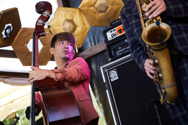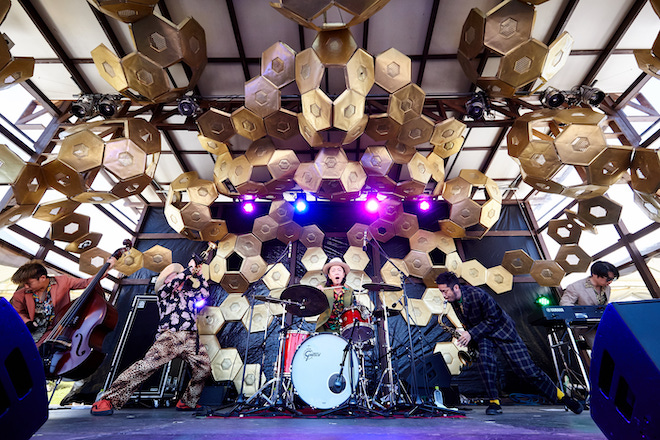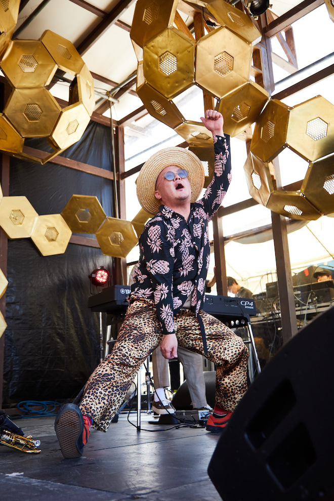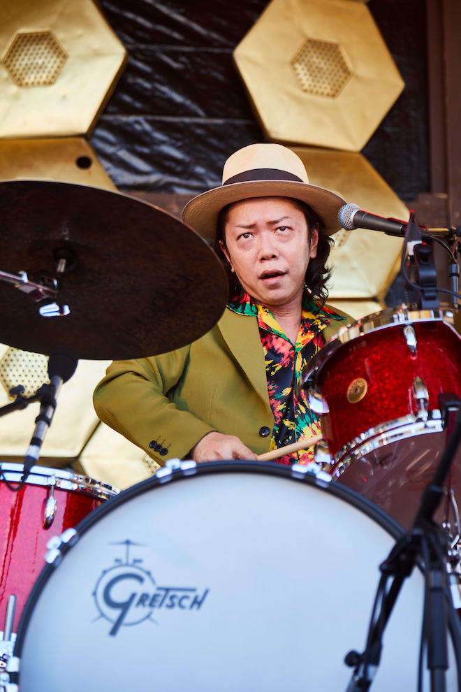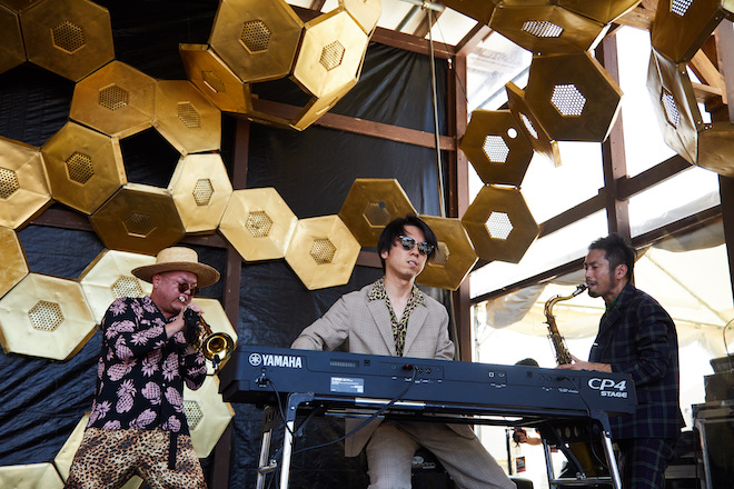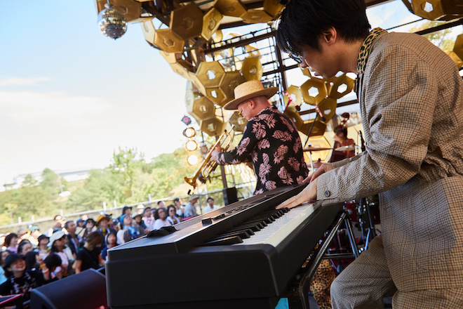 自ら“踊れるジャズバンド”と名乗っている彼らだが、ダンサブルなんて形容で済まされるほど小洒落たものではない。血が騒ぐぐらい刺激的で、エネルギーがほとばしる音と曲だ。1曲目「Maximum Shout」は、“ヘイホー、レッツ・ゴー!”とラモーンズの「Blitzkrieg Bop」のような叫びコーラスもフィーチャリング。客席エリア後方にいた小さい子供も、伊藤の叫び声に煽られて、腕を上げながら一緒に叫んじゃっている。客席エリア全体からオーディエンスのステップで土ぼこりも舞い上がっている。それでも「まだまだ踊れるか!」と煽り続けながら演奏を決めるTRI4TH。