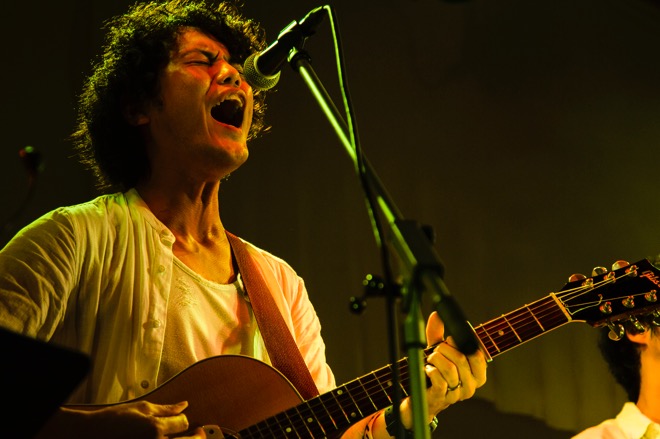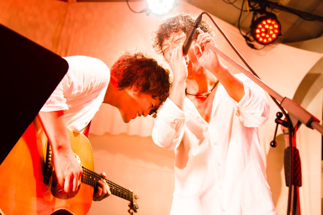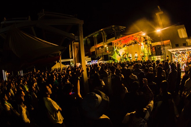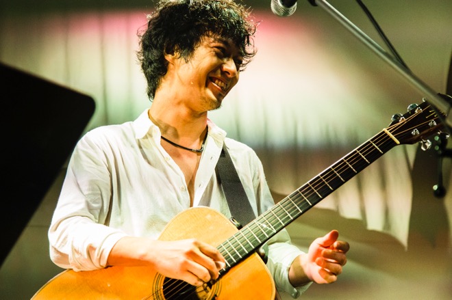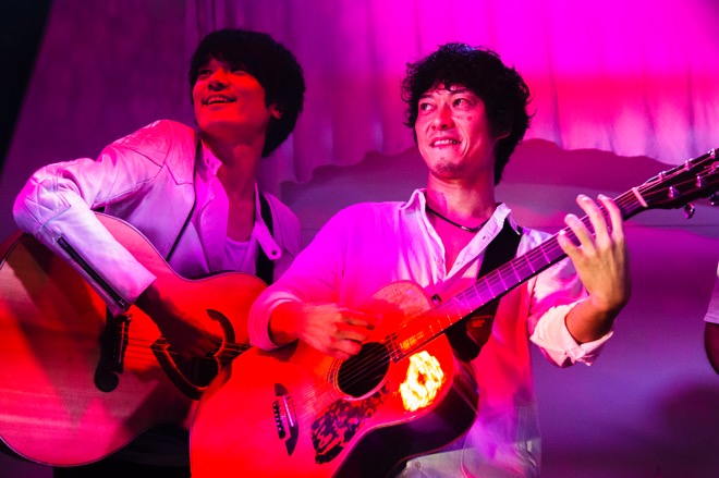 さらに、a flood of circleの「Honey Moon Song」へ。亮介は「それぞれの兄さんたちと出会ったとき、こんな日が来ると思ってなかったんですけど、やり続けてれば不可能はないと、そう思う」としみじみ。菅原卓郎(9mm Parabellum Bullet)のハープもあいまって、美しい旋律が夜空を駆けた。欧陽菲菲の「ラヴ・イズ・オーヴァー」即興セッションという場末のスナック的時間を挟み、今度は「夏の終わりのハーモニー」のがっつりカバーを披露。玉置浩二と井上陽水がふたりずつ降臨していた。