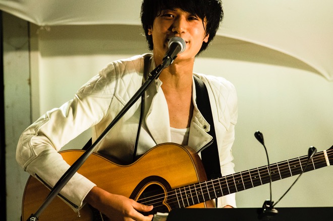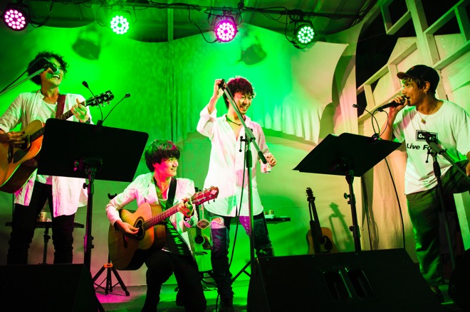 まずは山田将司(THE BACK HORN)が音頭をとって乾杯。常に軽妙なトーク(とても書けない下ネタを含む)を展開しつつ、ライブは唯一のオリジナルナンバー「SHIKABANEのテーマ」にて口火を切る。全員がアコースティックギターを手に取るが、オブリを弾く亮介を除けばあとはみんなコード弾き。正直ギターは2本で十分だ(笑)。