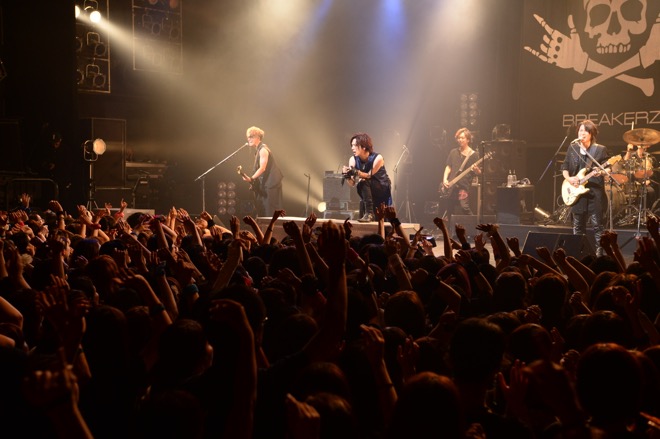 DAIGOのメッセージに続けて贈られたのは“青”をテーマに制作されたミニアルバム『アオノミライ』(2008年リリース)のタイトルチューンだ。SHINPEIが作曲した開放感たっぷりのナンバーにブルーの照明が降り注ぎ、BREAKERZの初期のナンバーがたっぷり盛り込まれたセットリスト。フロアがいっせいにジャンプしたミクスチャーナンバー「BIG BANG!」ではAKIHIDEとSHINPEIがポジションチェンジし、再びアグレッシヴなステージが繰り広げられ、爆発寸前のラブソングを歌うDAIGOが前列に手を伸ばすと引きずりこまれそうな勢い。激しいアクトの中にいまのBREAKERZならではの大人の色気が匂い立つ。切なくも狂おしいボーカルにAKIHIDEの情熱的なフレージングが絡んでいく「Dark Night」ではDAIGOが髪の乱れも気にせずに熱唱する姿に惹きつけられた。そして汗がまとわりつくような空気を入れ替えるように、間髪入れずにMY FIRST STORYとのコラボ曲「NEVER ENDING STORY」ではフロアとタオルを振って一体になる光景が広がった。