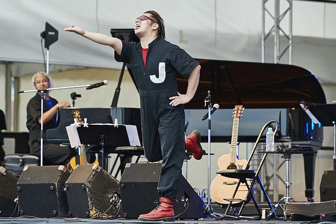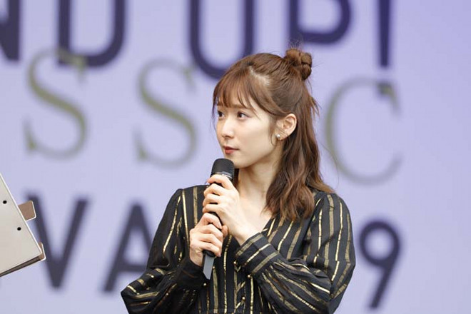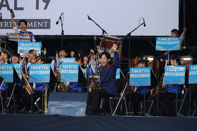 青いスパンコールのベストを身にまとった高津高等学校吹奏楽部。そのホーン隊が、横浜の音楽イベント<横浜音祭り>のファンファーレを華々しく奏でた。総合司会の松下奈緒がフェスのスタートを告げ、上野をステージに呼び出すと、さっそく彼はブラスバンドの一員となり、高校野球の応援歌としても人気の「フィンガー5コレクション」を演奏し始めた。