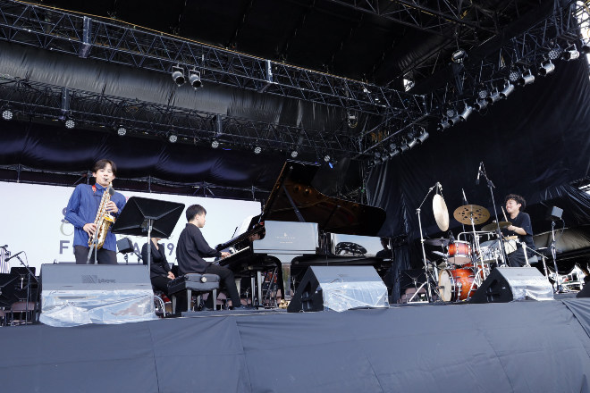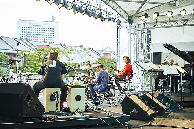 アドリブ応酬の「台風」の後は、STAND UP! ORCHESTRAのヴァイオリン3名が参加しての「jack」を演奏。最後はDEPAPEPEオリジナルの「One」。曇の多い空を遠くまで飛んでいきそうなメロディー。芝生に座る観客の胸に染み込む演奏でステージは大団円を迎えた。