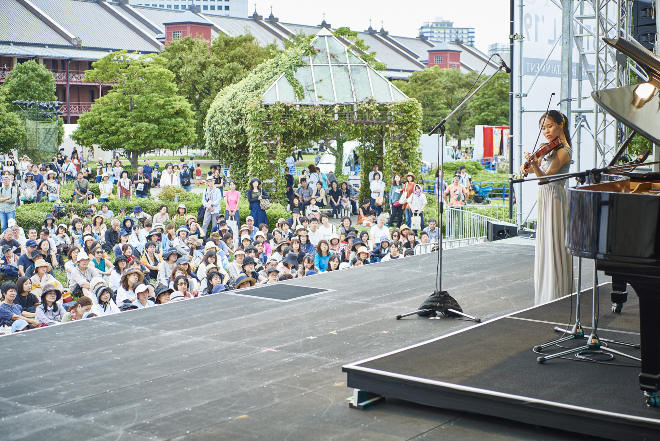 続いて登場したのは、赤いレースの施された美しいロングドレス姿の宮本笑里。映画『タイタニック』から、客船が行き交う横浜港の雰囲気にピッタリの「マイ・ハート・ウィル・ゴー・オン」。父と娘の愛を描いた『ゴッドファーザー PART III』からは、娘が撃たれて命を落とす終盤で流れる「カヴァレリア・ルスティカーナ 間奏曲」を演奏し、会場をうっとりとさせた。