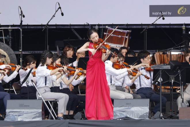 五嶋が「次の曲は、誰でも知ってるので説明しません!」と言いながら次の曲へ。イントロだけで会場の誰もが「あー、あの曲」と納得したことが手に取るようにわかるサラサーテ「ツィゴイネルワイゼン」。たっぷりと泣きの入った演奏の途中途中でおどけてみせたりする、五嶋の細かな表情が大型スクリーンに映される。スクリーンのおかげで、奏者の表情や指の動きなど、細部まで身近に感じることができる。