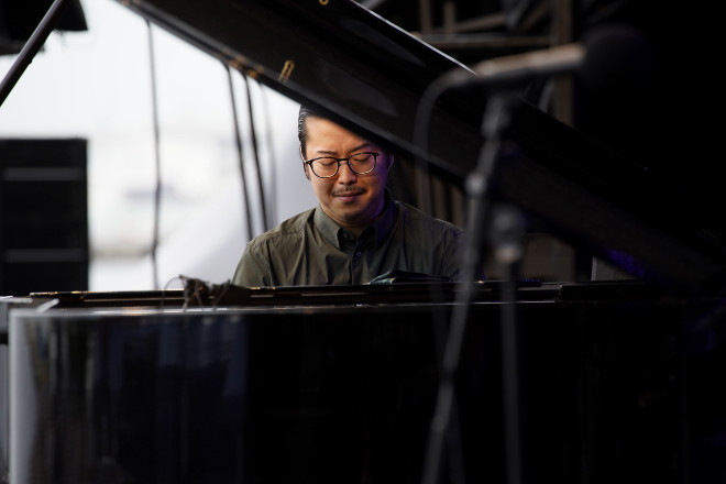 ここからはDEPAPEPEと→Pia-no-jaC←の共演。「flow」はテンションの効いたコードとノリでフュージョンぽく聴かせる。続く「G線上のアリア」は、それぞれがカバーしている演奏のアレンジを合体させ、世にも珍しいものとなった。美しく静かに始まったDEPAPEPEの演奏に→Pia-no-jaC←が加わって一気にヒートアップ。軽快で迫力あるリズムに乗ってピアノとギターがソロを繋いでいく。と、その時、フェリーの汽笛が「ボー!」。これこそが海辺のフェスの醍醐味だ。