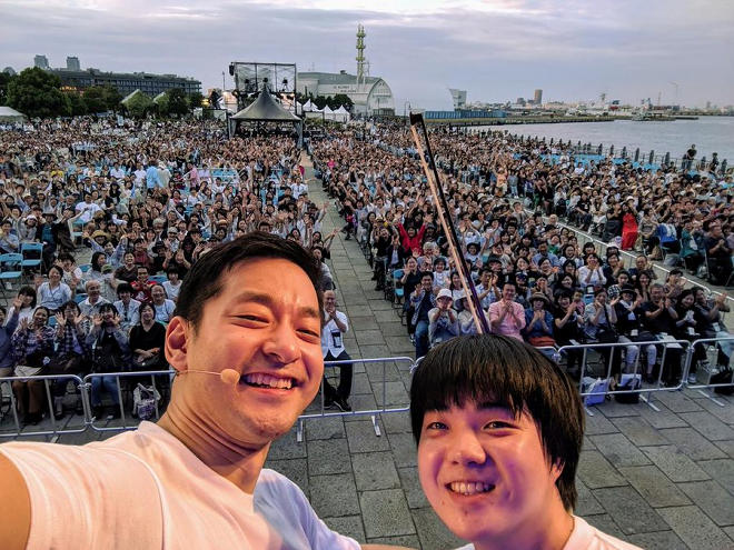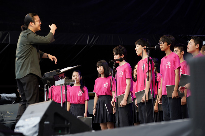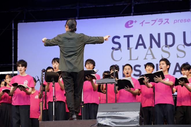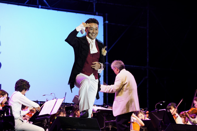 ショパンを堪能した後は、合唱曲が続く。「僕は吹奏楽やオーケストラも大好きですけど、合唱も盛り上げていきたい」と反田のMC。神奈川県高等学校合唱祭にて、2018年に教育長賞を受賞した、神奈川県立弥栄高等学校合唱部がステージへ。開放的なロケーションによく映える歌声が響き渡る。「くちびるに歌を」はドイツ語と日本語が織り交ぜられた合唱曲だが、ドイツ語を歌い上げる高校生の歌唱力に圧倒される。そしてスメタナ「モルダウ『我が祖国』より」からは反田がタクトを振り、合唱コンクールで受賞したという思い出深い上田真樹「僕が守る」が続く。