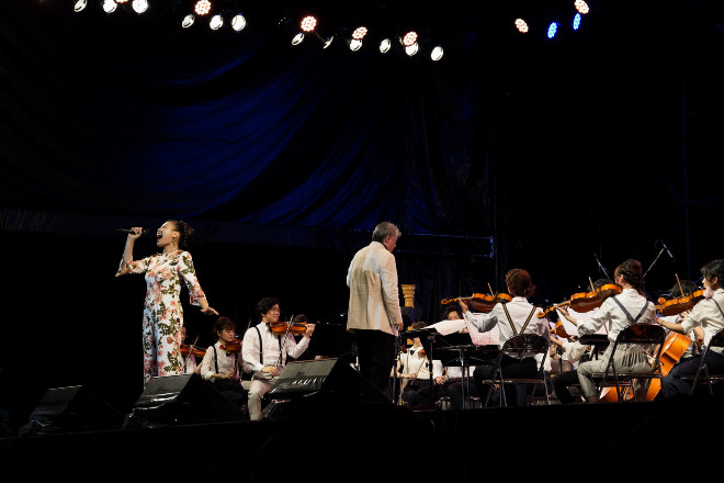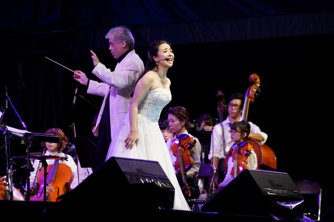 一日目のフィナーレを飾ったのは、オペラ歌手、ミュージカル俳優が一堂に会しての名曲プログラム。すっかり日の落ちた夜空の下吹き渡る海風が心地良い。