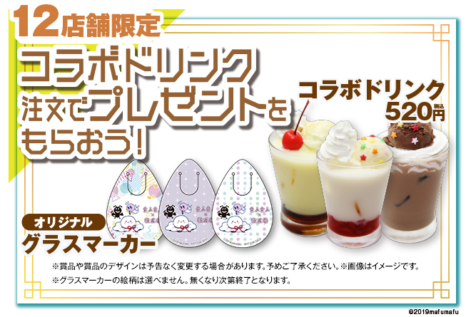 まふまふのイメージに合わせたドリンクを12店舗限定で販売。ドリンクは3種類。ドリンク注文でオリジナルグラスマーカーをプレゼントする。