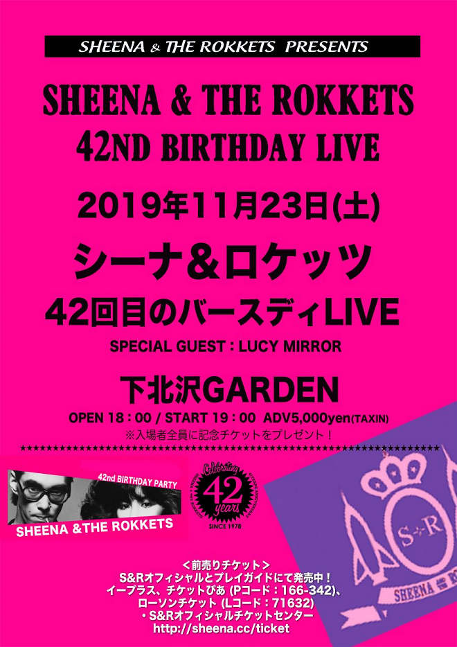 11月23日(土)<シーナ&ロケッツ42回目のバースディライブ>東京・下北沢GARDEN