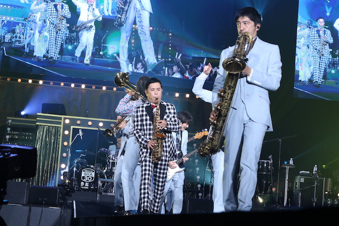 2曲目に披露された「Paradise Has No Border」は、アルコール飲料のテレビCM曲として大量にオンエアされたことや、全国の多くの小中高校の吹奏楽部で演奏されたりしていることから、インストナンバーでありながらお茶の間に浸透したスカパラの代表曲となっており、演奏されるや否や観客からも大歓声が沸き上がる。会場全体を盛り上げまくった曲の途中で、突然、GAMO(Tenor sax)がスペシャルゲストとして岡村隆史をステージに呼び込む。茂木欣一(Drums)の後方からポップアップで白と黒のチェック柄のスーツを身に纏った岡村隆史が登場すると、なんとその手にはアルトサックスが。会場中がどよめくなか、サビのメロディを岡村隆史がソロで演奏すると大歓声が沸き起こる。さらに、岡村隆史とNARGO(Trumpet)、北原雅彦(Trombone)、GAMO(Tenor sax)、谷中敦(Baritone sax)、加藤隆志(Guitar)、川上つよし(Key)の7人が演奏しながらセンターステージに向かって花道を進んでいく。大歓声のなかセンターステージでは岡村隆史を中心にフォーメーションを組んでサビを奏で、曲が締められた。