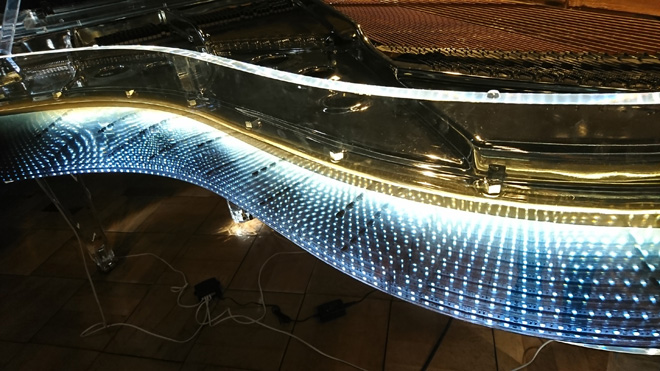山下:鏡面ですからライティングによって光を受けて反射するわけですが、ピアノ自体から発光する発想から、試行錯誤の後に発光体をピアノの中に内蔵することにしました。鏡に使ってるメッキの材料が半透過…つまり、光を反射しながら透過もするちょうどいいバランスになっているものですから、その特性を活かして棚板と側に外側からは見えない形で試作一号機に内蔵したんです。それをYOSHIKIさんに見せたら非常に喜んでいただいて、今ステージで使っていただいているのはLEDが点くようになっているんです。