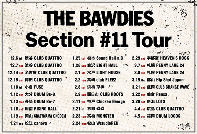結成15周年&メジャーデビュー10周年を迎えたTHE BAWDIESが、アニバーサリーイヤーの締め括りにして新章の第一歩となる2年9ヶ月ぶりのオリジナルフルアルバム『Section #11』を11月27日に発売する。今作の完全受注生産限定盤“DELUXE EDITION”及び初回限定盤の特典DVDに収録される企画“THE BAWDIES A GO-GO!!”の内容が、このたび明らかになった。