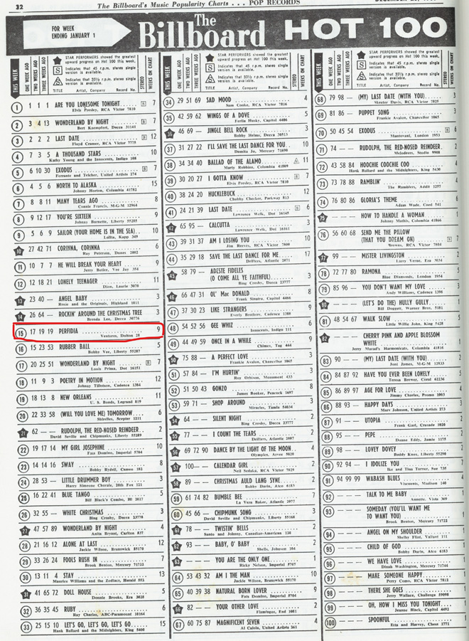 メドレー・スタイルで「パーフィディア」、これも初期のヒットだ。HOT100では60年10月31日付78位(★)初登場、その後44位(★)→31位(★)→21位(★)→18位→19位→18位→17位、そして12月26日付で最高位15位だ。