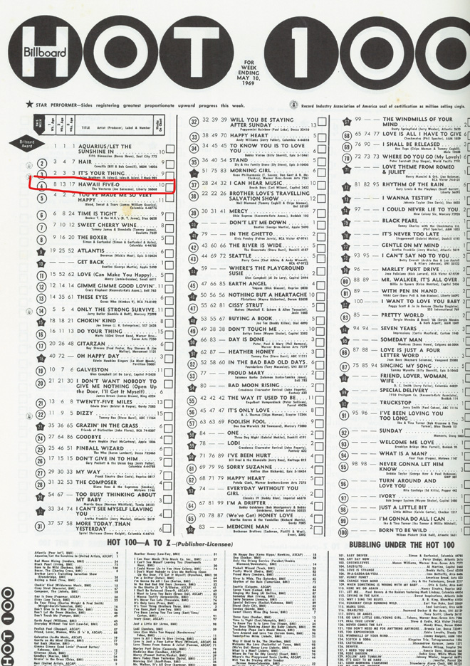 ここからは60年代後半から70年代にかけてのナンバーが登場。まずはベンチャーズ歌謡の「二人の銀座」。和泉雅子&山内賢(ベンチャーズ・プログラム用にインタビューしたことがある)で知られる。そしてベンチャーズの60年代後半のUSヒットの「ハワイ・ファイヴ・オー」(同名TV番組テーマ)。HOT100では69年3月8日付100位で初登場、その後99位→92位→70位(★)→51位(★)→32位(★)→17位(★)→13位(★)→8位(★)そして5月10日付で最高位4位。ベンチャーズにはやっぱり“海”がマッチする。