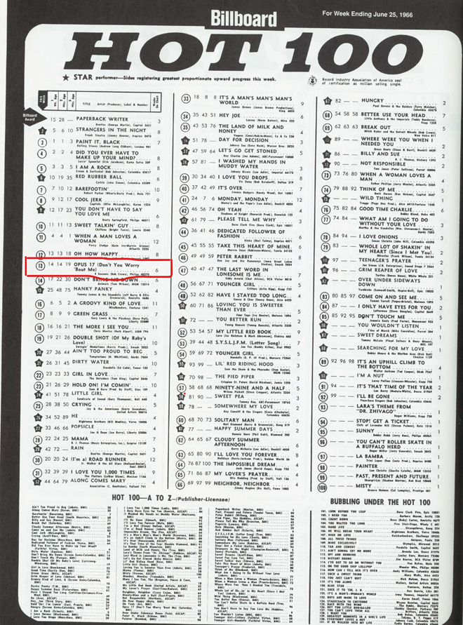 2曲目はメドレー形式でそのまま「Opus 17(Don’t Worry ‘bout Me)」。会場は早くも手拍子で盛り上がる。これも66年のヒット、HOT100では同年5月21日付63位(★)初登場その後、31位(★)→19位(★)→14位(★)→14位そして6月25日付で最高位13位。