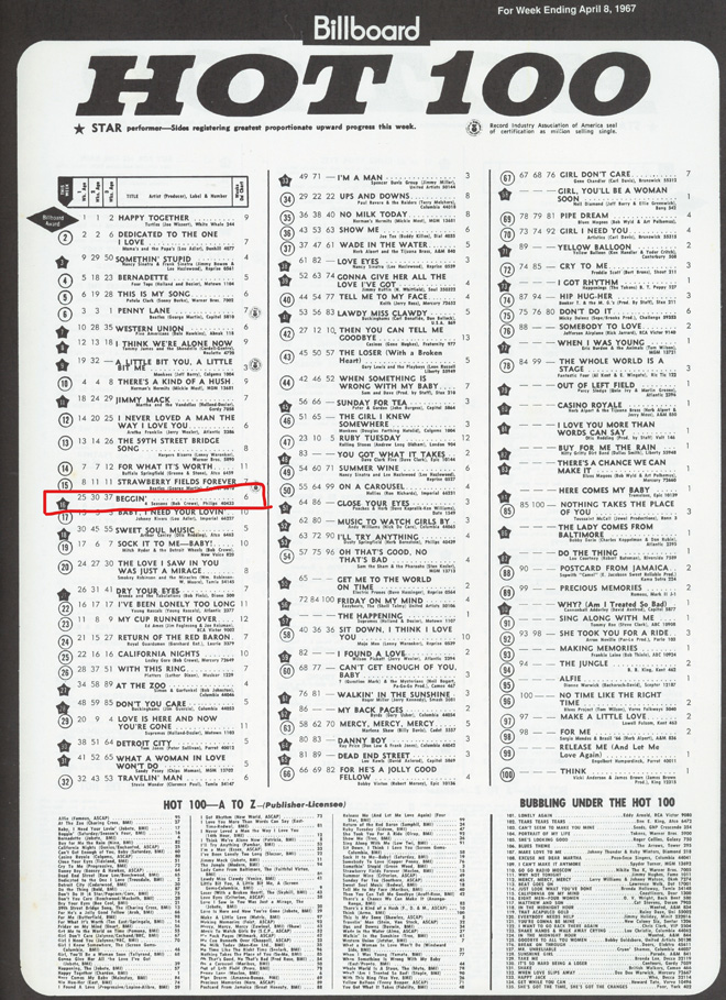 東京に再び来ることが出来てとても嬉しいと挨拶の後「Beggin’」。ブラス・セクションはお休みのポップな雰囲気。67年のナンバー。HOT100では同年3月4日付83位(★)初登場、その後56位(★)→37位(★)→30位(★)→25位(★)そして4月8日付&15日付で最高位16位(8日付のみ★)。