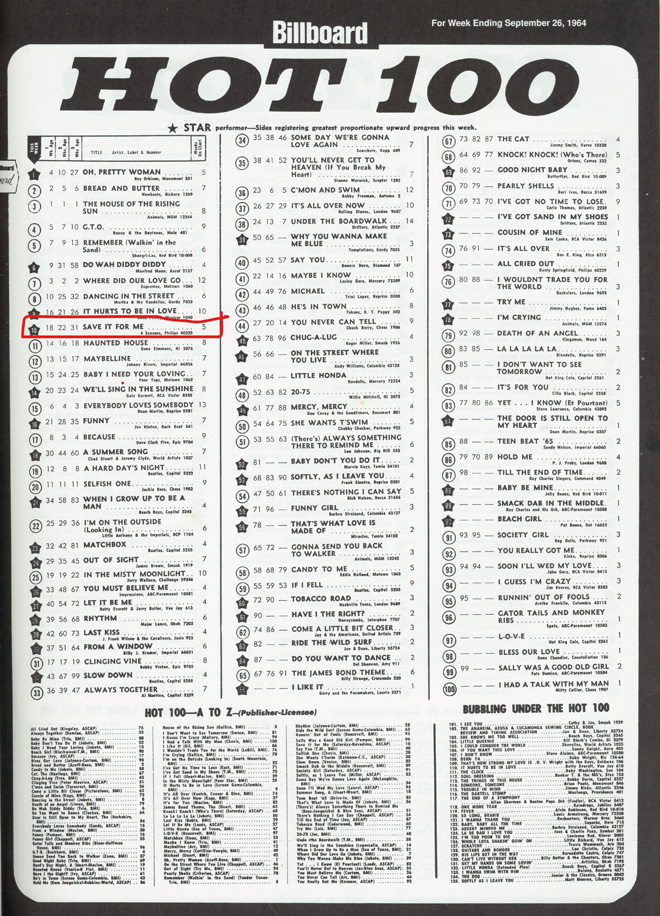 そして僕がザ・フォー・シーズンズを一番よく聴いていた64年にこれまたFENで流れていたのが「Save It For Me」。まさに4Sサウンド!HOT100では同年8月29日付64位(★)初登場、その後31位(★)→22位(★)→18位、そして9月26日付&10月3日付で最高位10位(9月26日付のみ★)。