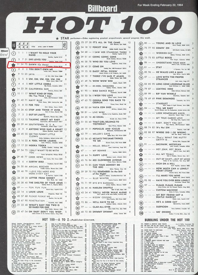 当時僕はアメリカン・ヒット・ソングのニュー・チューンズ・ファン・クラブの会員でレコード・コンサートでこのナンバーを楽しんでいたのだ。ザ・フォー・シーズンズの大ヒットでHOT100では64年2月1日付75位(★)初登場、その後24位(★)→11位(★)そして2月22日、29日付&3月7日付で最高位3位(2月22日付のみ★)。