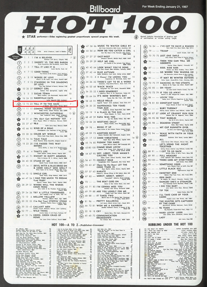 ザ・フォー・シーズンズ・ヒット・パレードを21世紀になってLIVEで堪能出来るなんてまさに夢の夢だ。“雨に言っておくれ”この邦題が好きだった。アップ・テンポの軽快なポップ・ソング「Tell It To The Rain」。66~67年のヒット。HOT100では66年12月10日付92位初登場、その後58位(★)→31位(★)→23位(★)→15位(★)→12位、そして67年1月21日付で最高位10位。