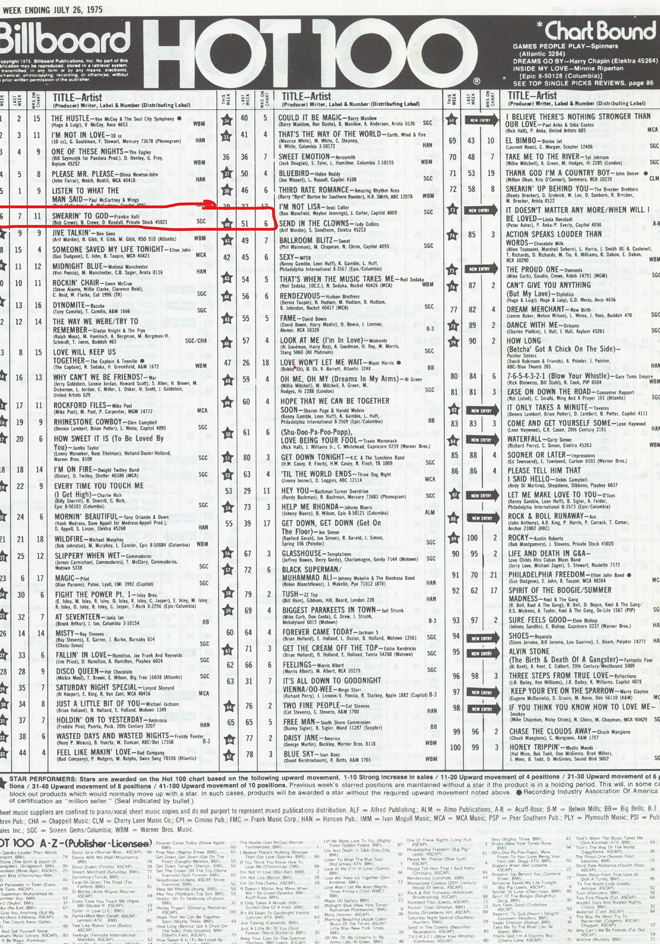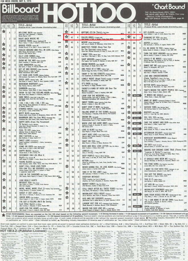 そしてフランキーのフェイヴァリット「Fallen Angel」。スロー・バラードのとってもロマンティックなナンバーだ。76年のフランキーのソロ・シングル、HOT100では同年4月3日付81位(★)初登場、その後68位(★)→58位(★)→48位(★)→42位(★)そして5月8日付&15日付で最高位36位(8日付のみ★)。
