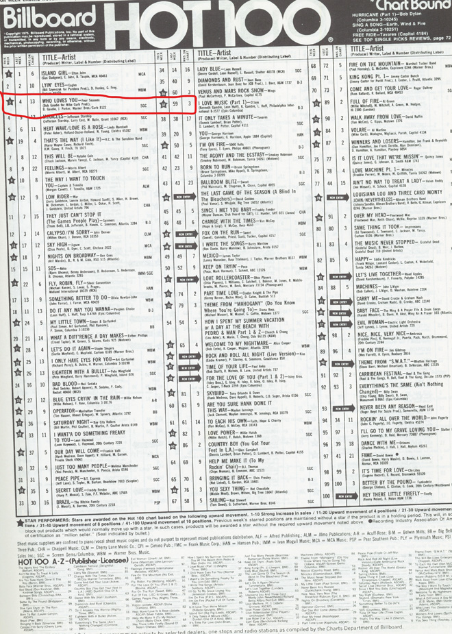 「Who Loves You」はザ・フォー・シーズンのモータウン・チューン。75年のシングル・ナンバー、HOT100では同年8月23日付88位(★)初登場、その後78位(★)→66位(★)→54位(★)→40位(★)→30位(★)→17位(★)→14位(★)→10位(★)→7位(★)→6位(★)→4位(★)そして11月15日付&22日付で最高位3位(15日付のみ★)。ダンサブルなディスコ・サウンド。