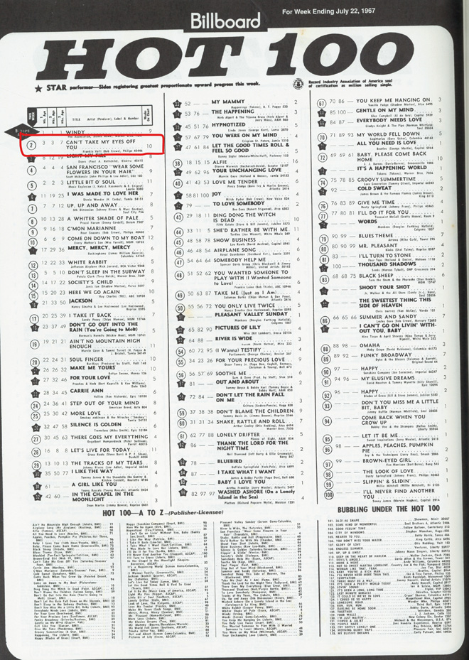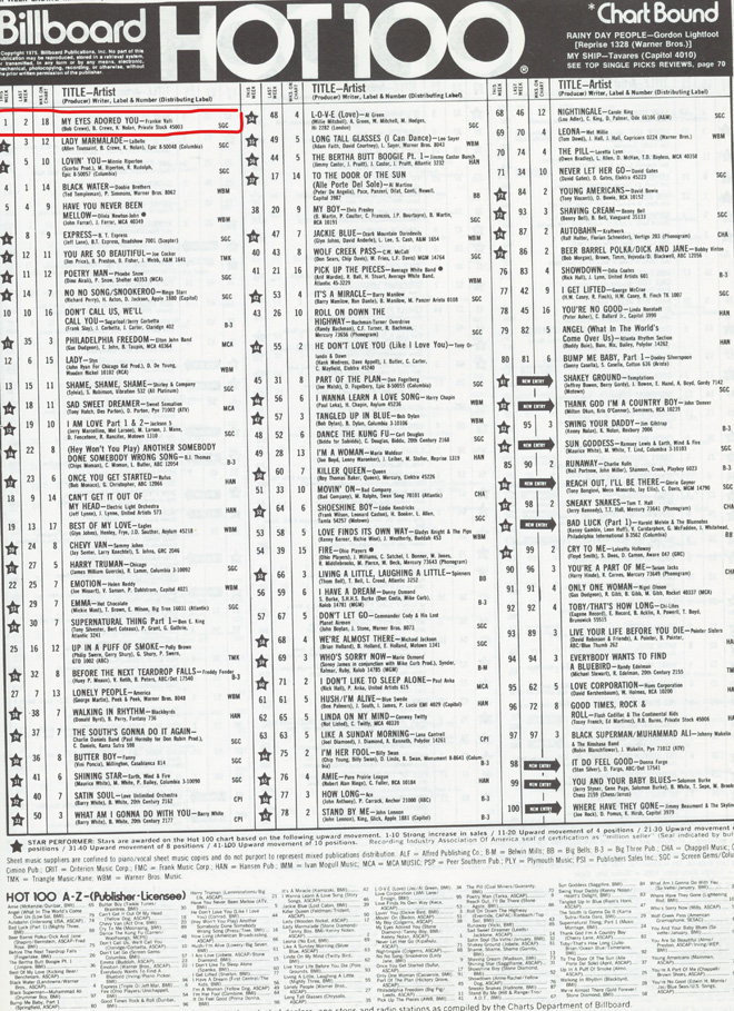 「My Eyes Adored You」はザ・フォー・シーズンズとして74年にレコーディングされた楽曲。しかしその直後フランキーのソロとしてシングル・リリースされ、74年末から75年初頭にかけて大ヒットした。HOT100では74年11月23日付94位(★)初登場、その後90位→79位(★)→68位(★)→65位→55位(★)→52位→48位→40位(★)→32位(★)→28位(★)→12位(★)→9位(★)→7位(★)→4位(★)→3位(★)→2位(★)そして75年3月22日付で最高位1位。ゴールド・シングルを獲得している(RIAA)。場内はペンライトや携帯の明かりで盛り上がる。