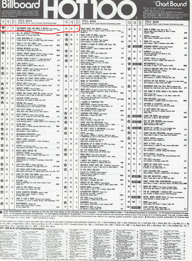 そのままの盛り上がりが今度は手拍子、イントロでフランキーは水分補給。これまたお馴染み「December 1963(Oh What A Night)」、ザ・フォー・シーズンズの75年末の作品で翌年前半に大ヒットした。HOT100では75年12月27日付85位(★)初登場、その後74位(★)→64位(★)→54位(★)→44位(★)→40位(★)→28位(★)→18位(★)→12位(★)→5位(★)→3位(★)そして76年3月13日付20日付27日付で最高位1位(3週とも★)。ゴールド・シングルを獲得。この日のステージでもレコード同様フランキーはサブでヴォーカル担当。会場で久しぶりに会った若い4Sマニアはこの辺もしっかりチェックしていた…。