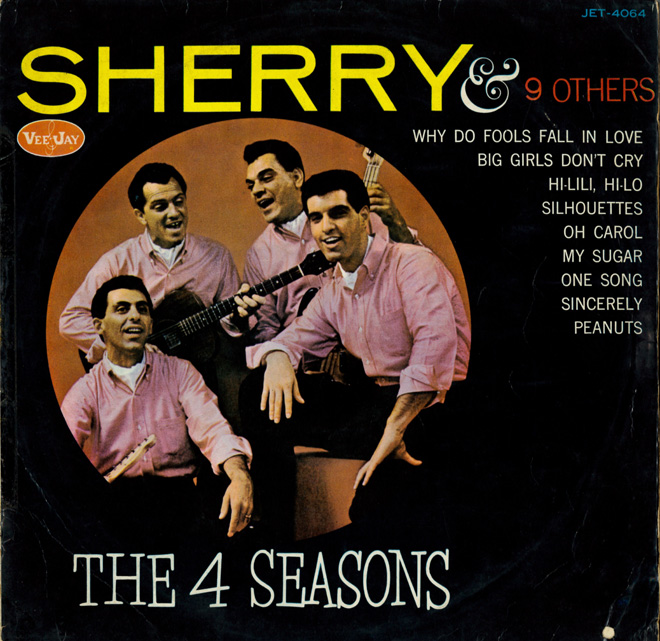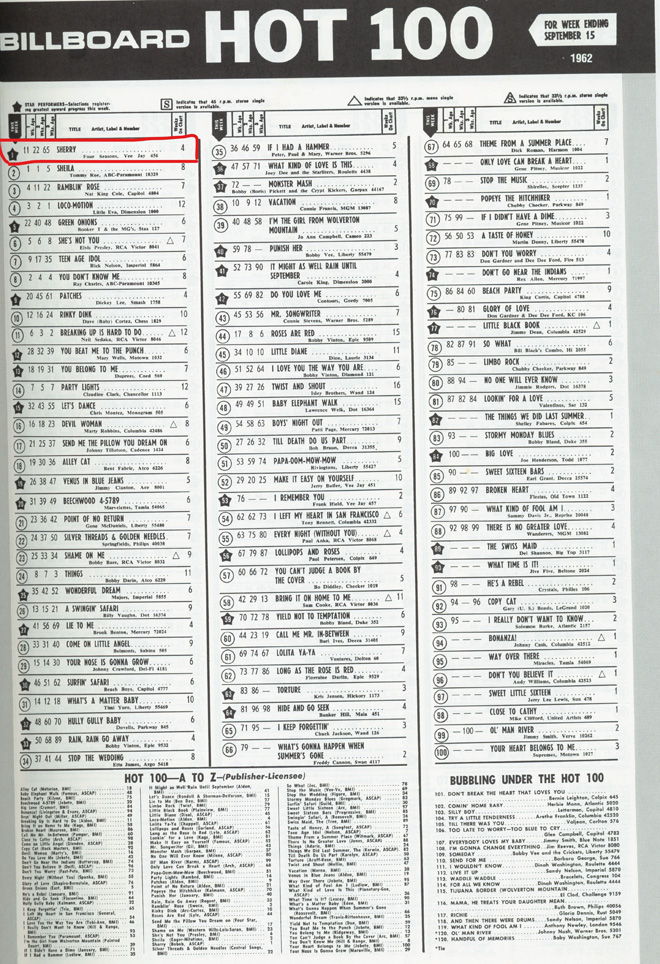 まずは「Sherry」、グループ62年のファースト・ヒット(彼らはその前に1枚シングルをリリースしたがヒットしなかった)。まさに白人ドゥ・ワップ。HOT100では同年8月25日付65位(★)初登場、その後22位(★)→11位(★)そして9月15日付から連続5週1位(15日付★。22日付、29日付、10月6日付、13日付)。R&Bチャートでも見事ナンバー・ワンに輝いている。わが国でも大ヒットし“POPS BEST 10 ”では63年2月23日付から10週連続1位で同年の年間チャートでも5位を記録した。