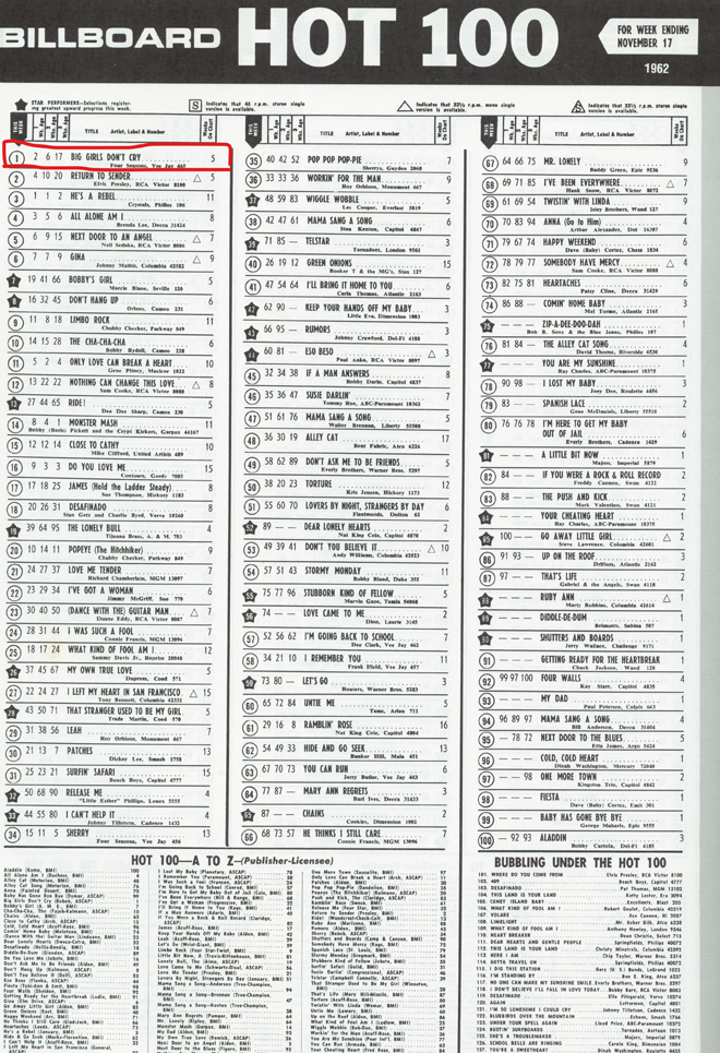 “恋はヤセがまん”「Big Girl Don’t Cry」は“シェリー”に続いての同年ナンバー・ワン・ヒット。HOT100では10月20日付66位(★)初登場、その後17位(★)→6位(★)→2位そして11月17日付から5週連続1位(24日付、12月1日付、8日付、15日付)。R&Bチャートで3週1位を記録。観客コーラス隊がこんなにもハモれるなんて爺は涙&涙だった。手拍子も凄い。