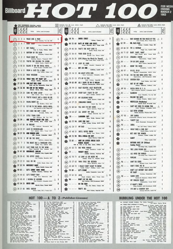 そしてこれまた涙なしではシャウト出来ない“恋のハリキリ・ボーイ”こと「Walk Like A Man」。63年に大ヒット、これもナンバー・ワン・ソングなのだ。HOT100では同年1月26日付40位(★)で初登場、その後15位(★)→6位(★)→3位(★)→3位そして3月2日付、9日付、16日付の3週1位。R&Bチャートでも3位。