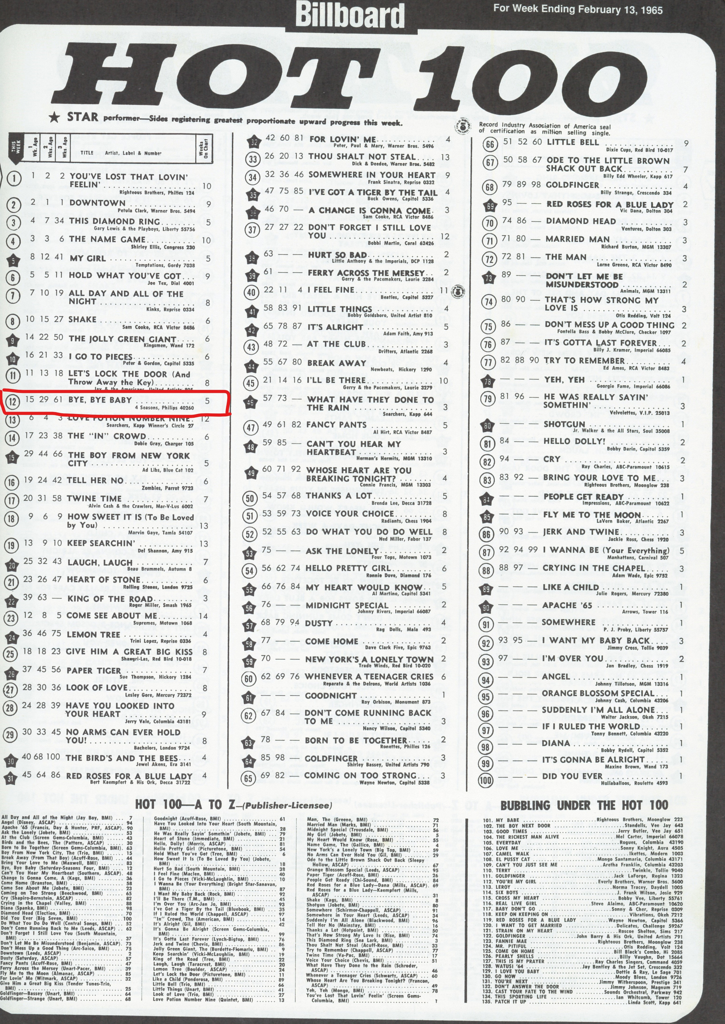 そして「Bye, Bye, Baby(Baby Goodbye)」はザ・フォー・シーズンズ65年の話題曲。HOT100では同年1月16日付87位(★)初登場、その後→61位(★)→29位(★)→15位(★)そして2月13日付&20日付で最高位12位。アップ・テンポのエキサイティングな雰囲気の中で観客の手拍子がより大きくエクスプロージョン。