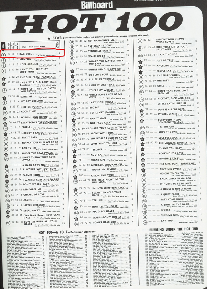 でもまだあの曲が出てこない。ナンバー・ワン・ヒットの♪Ooh Ooh ~Ah Ah~♪。そう64年の “悲しきラグ・ドール”「Rag Doll」。アンコールで遂にこの曲が登場した。当時FENで毎日幾度となく流れていた。HOT100では同年6月20日付53位(★)で初登場、その後18位(★)→8位(★)→3位(★)そして7月18日付&25日付2週1位(余談、18日付1~20位はすべて歌えちゃったりします)。ゴールド・シングルを獲得した。わが国では69年にリバイバルした。