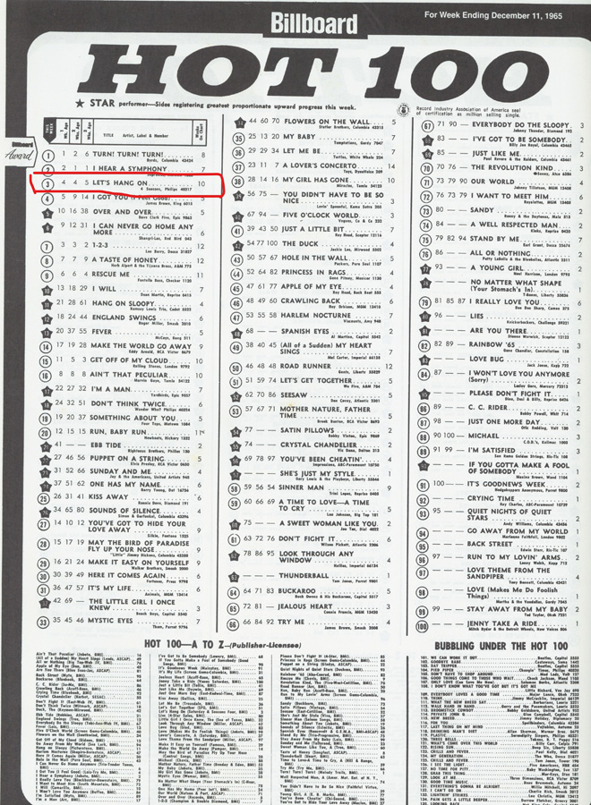 そしてワン・モア・ソング「Let’s Hang On」。高校受験勉強そっちのけでFENばかり聴いていた頃、このナンバーはちょっぴりお洒落な楽曲だと感じた。65年のヒットでとてもリズミックなサウンドが印象的。HOT100では同年10月9日付72位(★)初登場、その後60位(★)→41位(★)→18位(★)→13位(★)→8位(★)→5位(★)→4位→4位そして12月11日付3位が最高位。