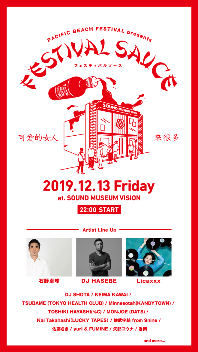 12月13日(金)にSOUND MUSEUM VISIONにて開催されるイベント<PACIFIC BEACH FESTIVAL presents FESTIVAL SAUCE>より、出演者の第一弾発表が行われた。