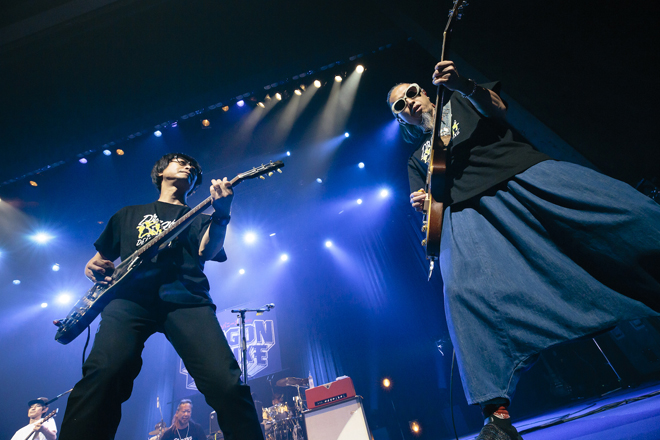 最後はファンの期待通り、フラワーカンパニーズとスピッツによるセッションだ。2バンドがこの日限定のTシャツ(しかもパートごとにお揃い!)を身につけステージ上に並ぶ、不思議で、贅沢な光景。内容も贅沢そのもの。「ヒバリのこころ」「最⾼の夏」「野⽣のポルカ」「恋をしましょう」と、お互いの曲をお互いに選んだという楽曲を演奏していく。ステージ上に9人が並びかつてない音圧で豪華すぎるセッションは続いていく。1曲1曲、丁寧にMCを挟みながら進めていく姿は、この贅沢な瞬間を、彼ら自身がじっくりと味わっているかのようでもあった。鈴木の止まらないおしゃべりを草野が「歳をとると話が長くなるからね(笑)」と締めた後のラストナンバーでは、名古屋の地元ラーメンチェーン「寿がきや」のキャラクター、スーちゃんが登場し、歌う曲は「男性デュオの曲でとにかく盛り上がる曲」とCHAGE and ASKAの「YAH YAH YAH」というカオスな展開。メンバー、オーディエンスともに拳をホールの天井に突き上げて、濃厚で貴重な一日を終えた。最後に巻き起こった一際大きな拍手は、普段は絶対に見られないステージへの称賛、感謝、感嘆、いろいろな感情が混じっているようだった。
